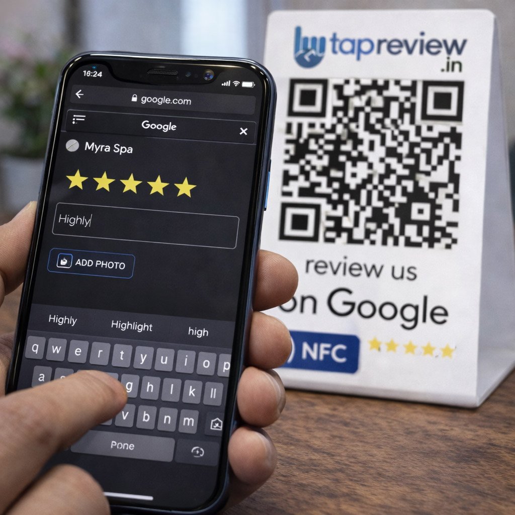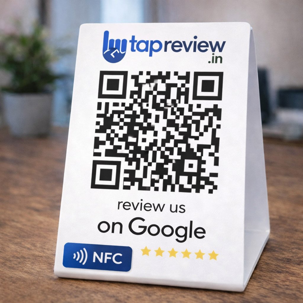 Boost your Google Business profile instantly with our QR Code & NFC Google Review stands designed for Indian shops, restaurants, salons, clinics, and local businesses.